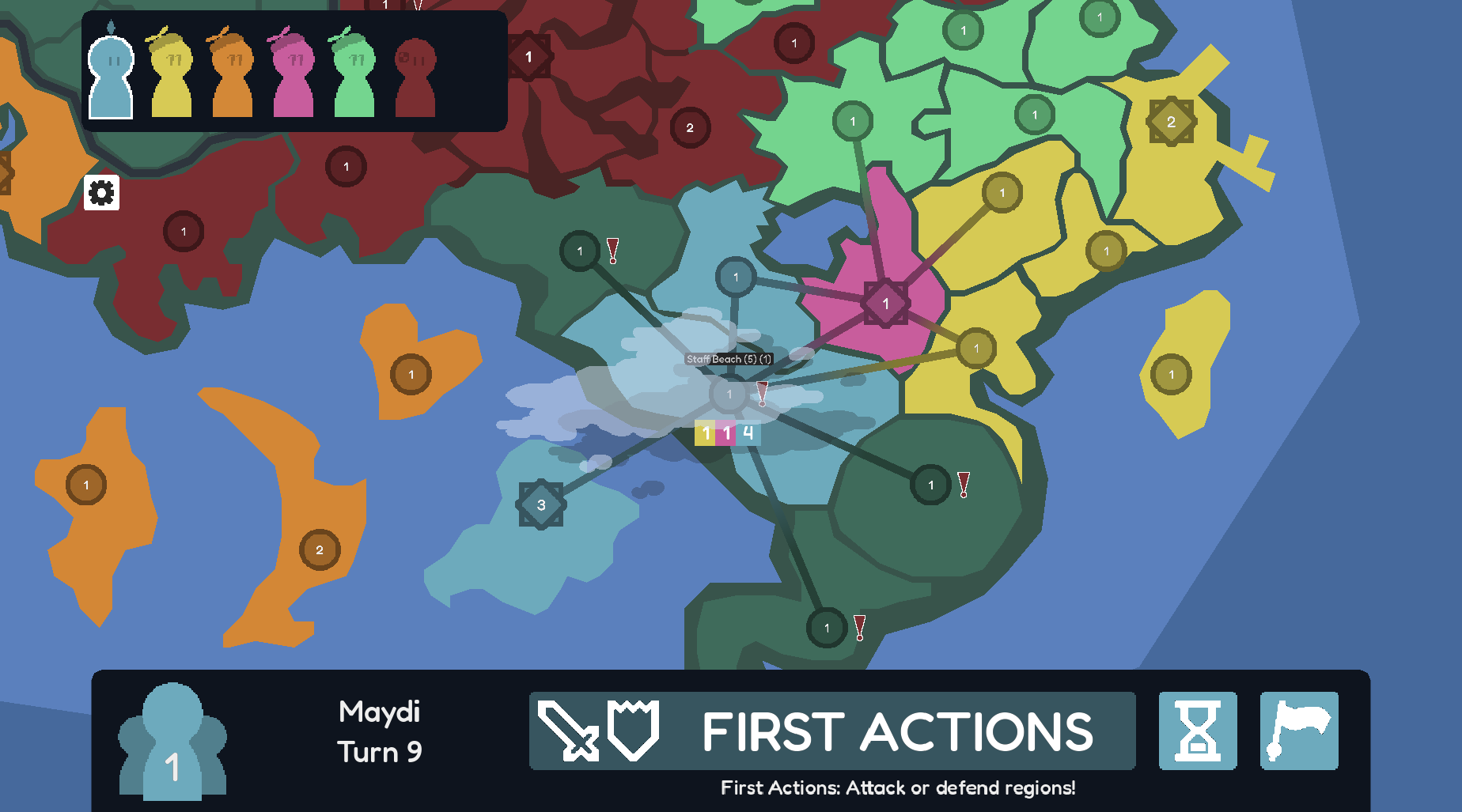 Tabin's Regions is a turn-based strategy game about capturing colored regions. Following a simple ruleset, your goal is to take all of your opponents regions, and once you do, you win! You can play on 30 unique maps of varying layouts and sizes. Battle solo against computer players, or duke it out in a battle of wits with your friends in local multiplayer!
